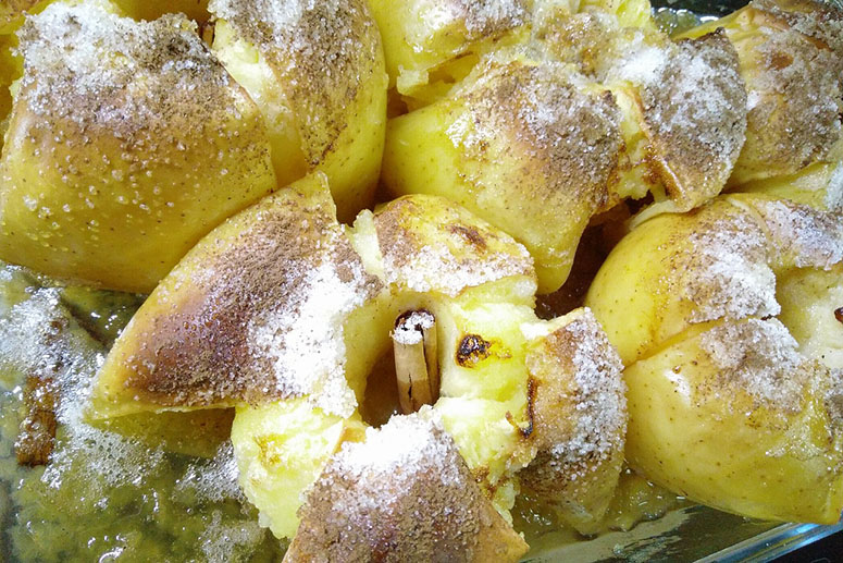 - Посыпьте яблоки корицей и отправьте в предварительно разогретую до 200 градусов духовку на полчаса (время приготовления может немного варьироваться в зависимости от сорта яблок).