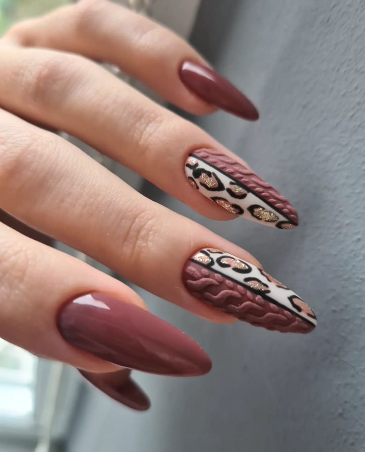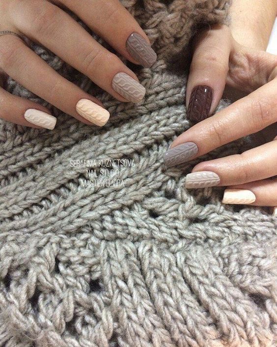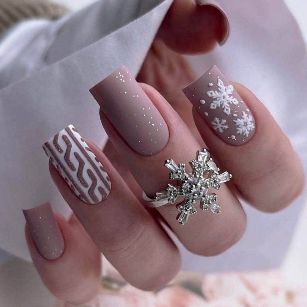 Не виходять із моди зимові візерунки: сніжинки, ялинки, нордичні орнаменти, крижаний градієнт. Все частіше майстри використовують техніку об’ємного дизайну — так званий “светрик”, що нагадує в’язані візерунки. Такий манікюр виглядає дуже ніжно й особливо доречно в холодну пору.